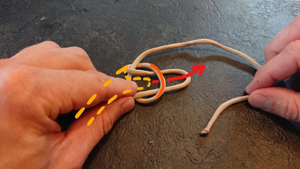 - De la main droite, pincez le courant, puis tirez simultanément sur le dormant et sur le courant. Le nœud doit s’inverser, et finir bien compact